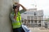 Gelbe Umrisszeichnung eines Bauarbeiters mit Schutzhelm und einer Glühbirne.